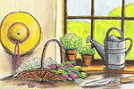 2005tuinattributen zoals strohoed bloemenmand, voor venster in oloepastel met inkt