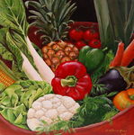 2008allerlei fruit in een stilleven met blauwe achtergrond